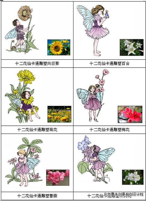 十二花仙卡通雕塑位于一个小型广场的一侧。雕塑是以十二花仙的故事为背景,选取了园区内的十二种花为形象,然后运用夸张、变形等手法进行卡通塑造,既表现出花仙子的浪漫唯美,又反映了花仙子的可爱童真,放在广场的一侧也丰富了广场的视觉景观,同时,凸显园区文化。